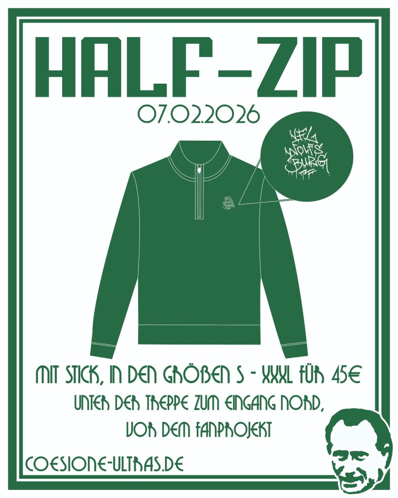 am kommenden Heimspiel gegen Dortmund verkaufen wir unseren neu eingetroffenen Half-Zip vor der Nordkurve.